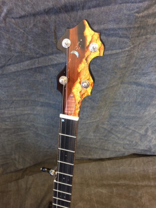 This is a banjo who wants to be beyond the typical banjo player. A space age look with a sound that is unbelievable. Moons and stars on the resonator and fret board, three ply maple rim and the look that is just amazing.