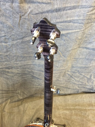 A truly artistic banjo that sounds as good as it looks.The Midnight Moon is black stained maple with highly figured, dark wood binding and a mix of pearl and marquetry inlay. The fretboard is adorned with constellation inlays.