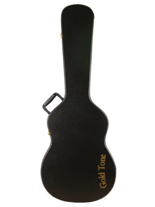 Hard shell case covered in black Tolex with Gold Tone logo for round-neck resonator guitar.